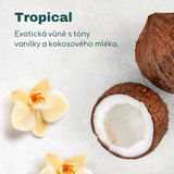 Díky obsaženému kokosovému oleji a bambuckému máslu hydratuje pokožku. Je příkladnou ukázkou rovnováhy mezi bezpečností přípravku a jeho funkčností, ingredience jsou pouze minerálního a rostlinného původu. S přírodní vůní Tropical, která voní stejně jako léto.